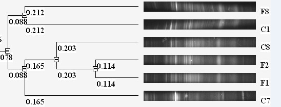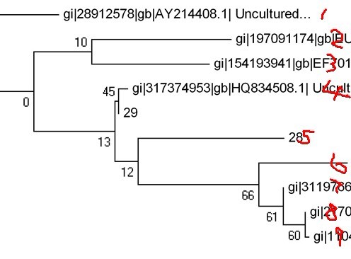 六楼的朋友说的对。不过我想补充一点。 针对楼主的问题“ 我想计算分支1,4 之间的距离和 分支6,8 之间距离,这两个距离哪个更近一些,用什么方法呢?” 1. 如果你想知道分支1,4或者6,8之间的精确遗传距离,要用序列相似性比对结果,做相似性矩阵(很多软件都可以,如你做聚类图的MEGA软件等等)能得到这两个样品间的相似性,乘以100%就是相似性百分数,数值越大相似性越高,反之越低。一般用相似性百分数表示两个样品间的遗传距离,分类学系统发育中的远近。 2. 聚类图分支长短是以相似性数值为依据的。聚在一起的样品其分支长度加和就要大于未聚在一起的样品,分支长度加和是你所选比例尺的多少倍就是你这两个样品间的遗传距离。因为是图示嘛,要一目了然,所以用了分支线的长短表示遗传距离,这样的表示比较清楚明了。呵呵 3. 关于图上的数值,它表示一个统计学上的意义。表示你这两个分支有多少次是被聚在一起的。如果是两位数就是说明你选的boot值(建树的软件有个参数选择)是100,如果你选1000次,值就会是三位数,一般要求选1000. 4. 参考文献不少,楼主可以在分类学的杂志上找找。 祝顺利。 |