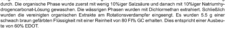 反应瓶中加入8.4毫升水和16毫升甲苯和11.2克(0.12mol)浓盐酸(37%)。然后反应瓶封闭,搅拌下,同时3,4-二乙氧基-2,5-二甲氧基-四氢呋喃,NaSH,甲苯和水的混合溶液加入(15.7克3,4-二乙氧基-2,5-二甲氧基-四氢呋喃,20毫升甲苯,11.2克NaSH(30%的NaSH,0.06mol)和10毫升水),控制反应瓶内压不超过20mbar。然后60度反应60分钟,冷却后,反应液静置分层,有机相先用少量的10%的稀盐酸洗涤,然后10%的碳酸钠水溶液洗涤,水相再用二氯甲烷萃取。最后有机相合并,旋转蒸发浓缩。最终得到5.5克浅棕色的液体,纯度80%,气相。相当于60%的收率得到EDOT |