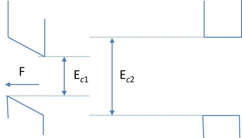 量子斯塔克效应,是指在垂直于量子阱平面方向上存在电场,电场的存在使电势发生变化,能带自然就发生倾斜。如图所示,左边的量子阱内存在一个电场,电子电势沿着电场线方向升高,因此产生图中的能带倾斜。与右边的无电场的量子阱相比,stark 效应使导带底和价带顶的能量差缩小,即有效禁带宽度变窄,因此发光波长会出现红移。此外,stark效应还会使载流子分别被电场扫至阱的两端,产生载流子的空间分离,降低辐射复合速率。