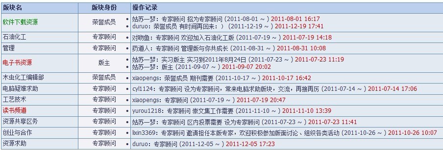 后来我又去申请了石油化工板块的专家顾问,当时版主说考察我几天,可是我耐不住性子,直接站内信给区长对吻鱼,再次申请石油化工版的专家顾问,没想到对吻鱼姐姐立即就给我权限,于2011年7月19日成功了做了石油化工版的专家顾问。在这里认识了石油化工版的版主jincanyan (尼莫鱼)。