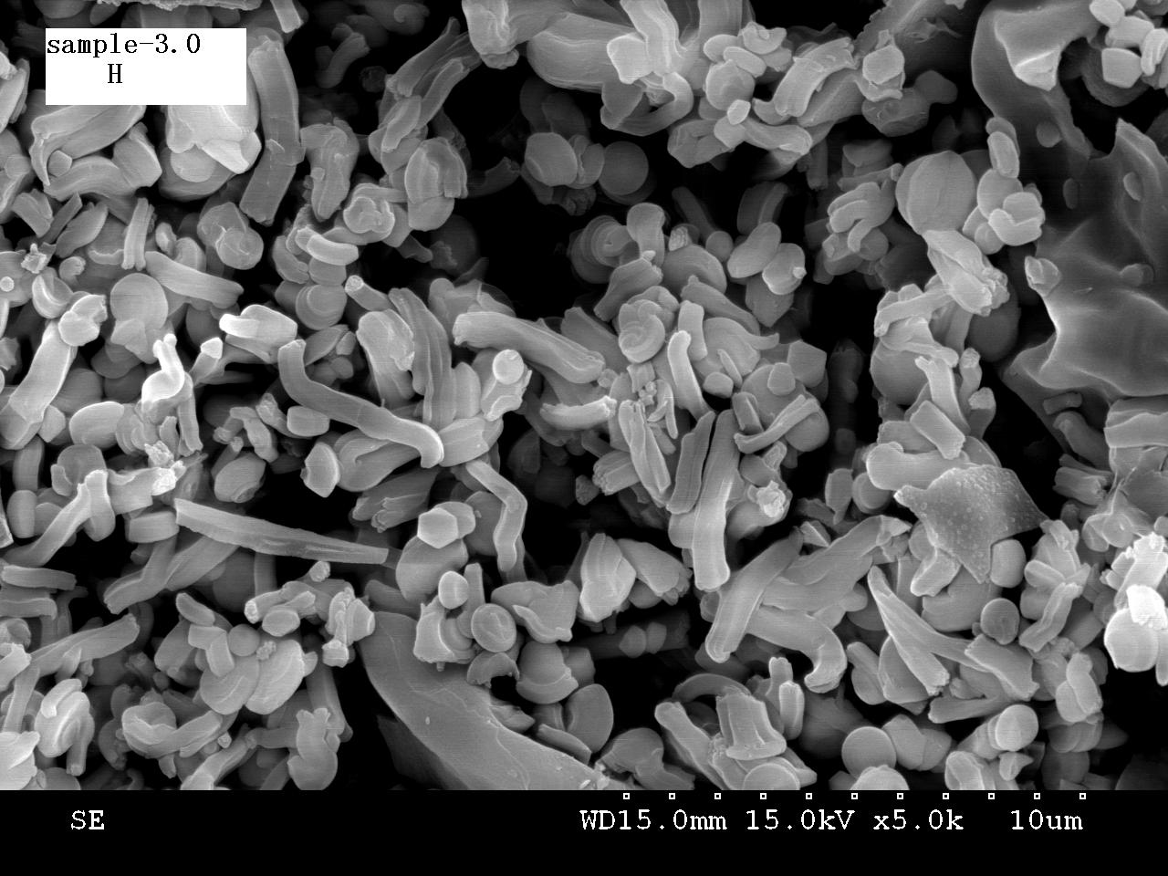 反应条件:水浴30℃,中速搅拌 实验步骤:1.取1.306g CTAB溶于52ml蒸馏水中,中速搅拌至溶解2.缓慢滴加4ml TEOS3.快速加入氨水4.继续搅拌至溶液全变成白色凝胶,抽滤5.120℃下干燥3小时6.在空气氛围中以5℃/分钟升温至550℃,焙烧5小时 nTEOS:nCTAB:nH2O:n氨水=1:0.206:165.55:x (x=0.2,0.6, 1.2, 3.0) 很明显随着氨水浓度的变化,SEM图上颗粒由小变大。生成分子筛的过程是:先向圆球状生长(见B图,块状分子筛表面生成球状颗粒);氨水量增加,分子筛全变成均匀的球形颗粒,见图sample-0.6;氨水到达一定浓度后,又向无序太生长,在sample-1.2时,就可以发现非常少量的条状颗粒(见F图);在sample-3.0时,颗粒变成各种形状,而且分子在电镜下的直径很大。为什么氨水加多了,形貌变杂乱了,变大了。用机理解释这个现象最好了。 10万倍 5万倍 10万倍 5万倍 10万倍 5万倍 2万倍 5千倍 [ 来自科研家族 催化剂生产企业大本营 ] [ Last edited by penguin1987 on 2012-2-17 at 20:29 ] |