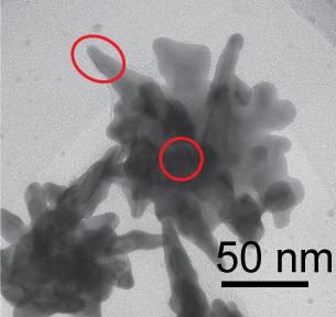 金纳米星TEM如图所示。 现在想测量红色线标注部分的元素组成。 用TEM中的 Energy-dispersive X-ray spectroscopy(EDS or EDX)能否分辨出来? 另外, EDS的横向分辨率大概是多少?是否包含颗粒表面下几纳米的信息? |