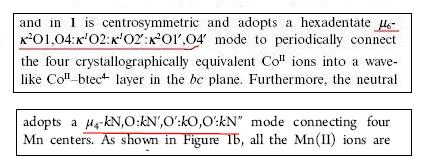 文献中有个配位模式的问题想了一早上没弄到,脑袋大啊,求解,麻烦了。 问题:κ上标 2 是什么意思?这么一串是以冒号还是逗号分开看啊?文献1中说一个配体连接四个金属原子,应该是μ4啊怎么是μ6啊?文献2中κ怎么又没上标啊?到底应该怎么理解。下图 文献1和2 |