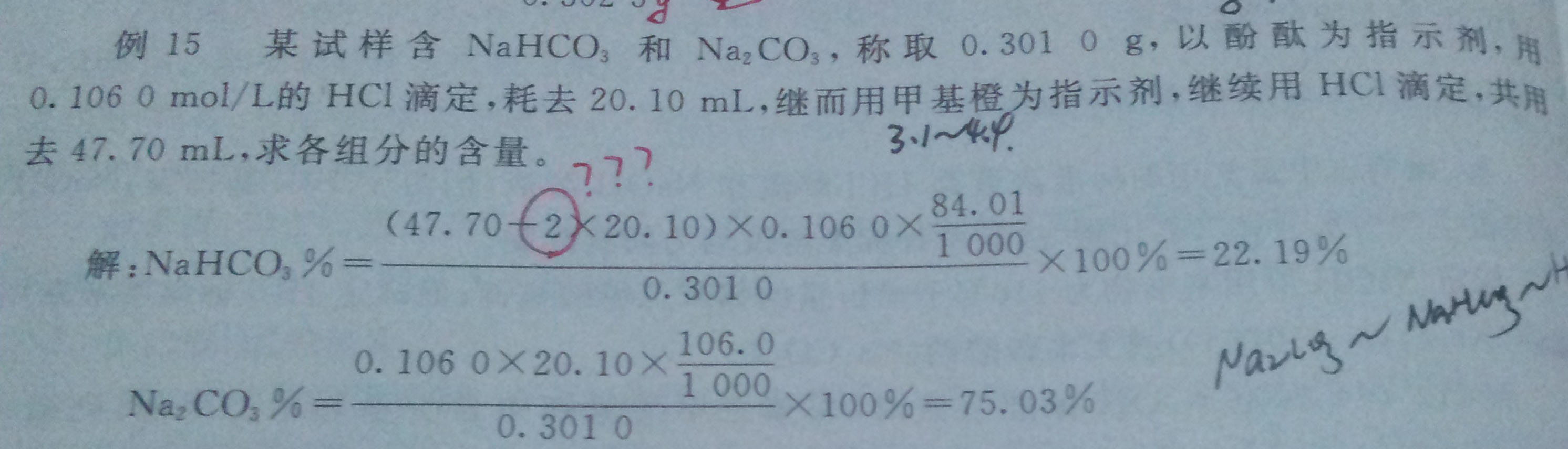 我不理解计算碳酸氢钠的含量时为什么要乘以2,,滴加盐酸的所有反应不都是1:1反应吗??
