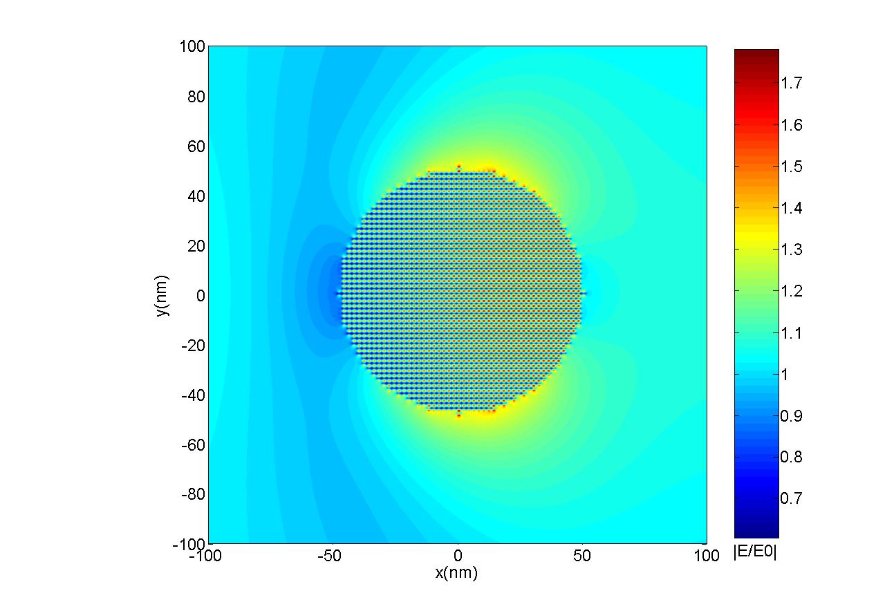 请教ddscat的near-field pattern,我选择用w150r000k000.pol1来计算,文件里显示的波长是500nm,结果为什么会是这样的?为什么有一个个分离的点,我w000r000k000.pol1计算,波长是200nm,图就没有这些分离的点。。。 另外,我计算的是100nm的颗粒,我取了65267个dipole,是不是因为dipole取的太少的原因?? |
