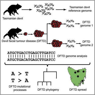 研究人员从中找到了肿瘤细胞之间的遗传差异,这表明这种癌症在袋獾群体中传播的时候,发生了遗传突变。他们在塔斯马尼亚州不同地区找到了69种不同袋獾的肿瘤样品,构建袋獾面部肿瘤传播的图谱,研究结果表明一些癌症亚型比其它亚型更具有侵染性。