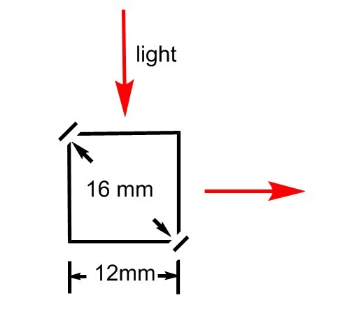 想在石英基片上修饰物质,进行荧光检测,看荧光光路在经过检测物时是90°的,不知道做的基片是做成下图中的16mm宽,还是做成12mm宽呢?基片如何放置才更合理呢?是放成与入射光45°,还是与入射光垂直呢? |