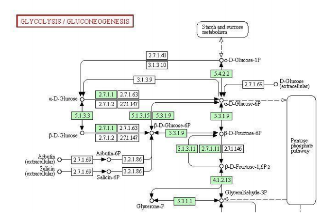 KEGG的pathway图中有的方块有的是绿色显示的,有的是无色的,是代表啥意思?哪路大仙教教俺,最好能帮忙详细解释下这张图中每一部分代表啥,不胜感激。。。