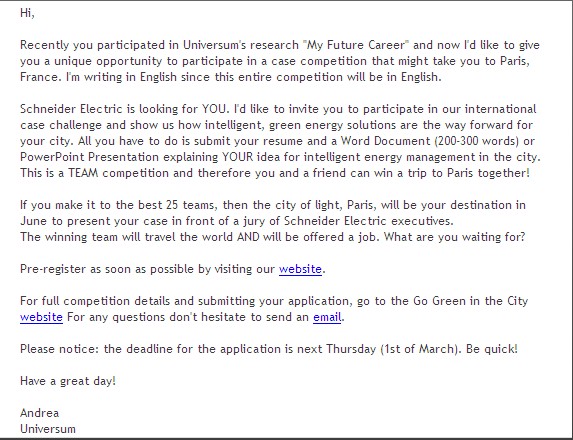 I received an email yesterday,the details are as follows: For I'm not familiar with this area,anyone who is interested in this competition can contact me,the links will be sent then. Remember the deadline for the application is next Thursday (1st of March). [ 来自科研家族 珊瑚岛 ] [ Last edited by jinghua88888 on 2012-2-24 at 13:07 ] |