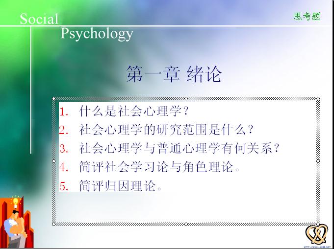 社会心理学是研究社会心理现象的科学,是从社会与个体相互作用的观点出发,研究特定社会生活条件下,个体与群体心理活动发生发展及其变化规律的科学。大家觉得好,记得评价哦!! [ Last edited by anyluk on 2012-2-26 at 14:16 ] |