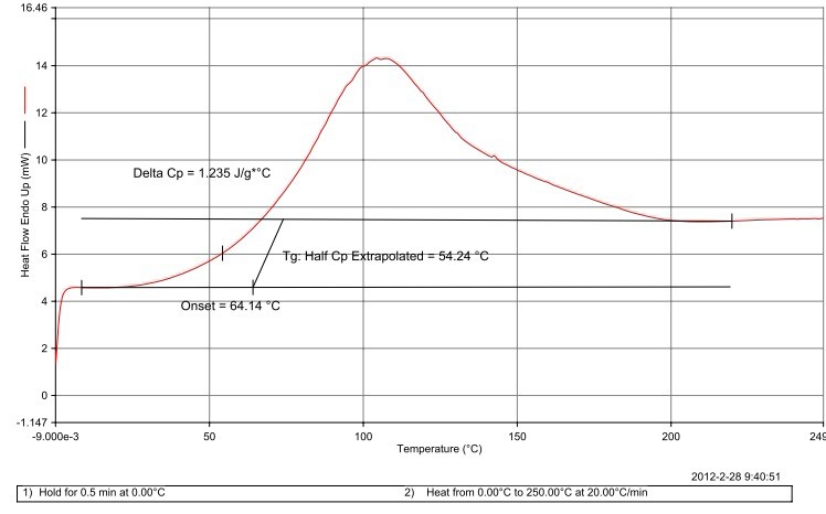 给位好!如图,分别为第一次和第二次升温后的DSC曲线,第一次升温的54.24℃是玻璃化转变温度吗??为什么第二次扫描就没有了。谢谢!