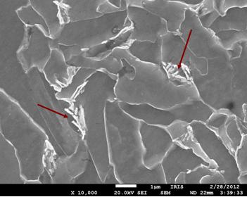 图片下方有放大倍数10 000倍,我个人觉得有可能是珠光体,但由于其尺寸偏小且片层状不是很典型,所以不敢确定。除了形貌外还能从其他方面进行判别吗?