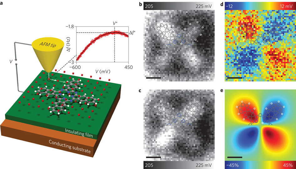 IBM公司使用特殊的原子力显微镜——开尔文探针力显微镜,在低温环境和超高真空内,直接为单个萘酞菁有机分子内的电荷分布进行了成像。 http://www.nature.com/nnano/jour ... /nnano.2012.20.html Imaging the charge distribution within a single molecule Fabian Mohn, Leo Gross, Nikolaj Moll & Gerhard Meyer Nature Nanotechnology (2012) doi:10.1038/nnano.2012.20 Scanning tunnelling microscopy and atomic force microscopy can be used to study the electronic and structural properties of surfaces, as well as molecules and nanostructures adsorbed on surfaces, with atomic precision, but they cannot directly probe the distribution of charge in these systems. However, another form of scanning probe microscopy, Kelvin probe force microscopy, can be used to measure the local contact potential difference between the scanning probe tip and the surface, a quantity that is closely related to the charge distribution on the surface. Here, we use a combination of scanning tunnelling microscopy, atomic force microscopy and Kelvin probe force microscopy to examine naphthalocyanine molecules (which have been used as molecular switches) on a thin insulating layer of NaCl on Cu(111). We show that Kelvin probe force microscopy can map the local contact potential difference of this system with submolecular resolution, and we use density functional theory calculations to verify that these maps reflect the intramolecular distribution of charge. This approach could help to provide fundamental insights into single-molecule switching and bond formation, processes that are usually accompanied by the redistribution of charge within or between molecules. |