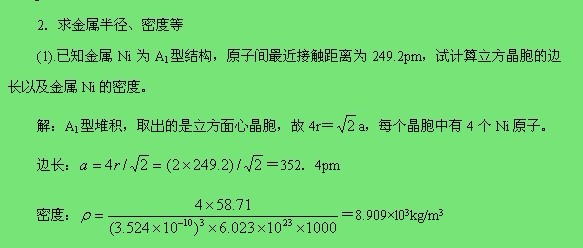 [求助]结构化学1题: 已知金属Ni为A1型结构,原子间最近接触距离为249.2pm,试计算立方晶胞的边长及金属Ni的密度。 |