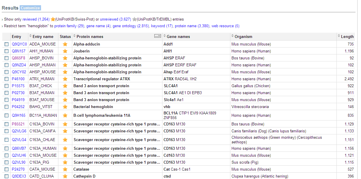我在http://www.expasy.org/ 这个数据库中输入关键词“hemoglobin” 弹出图1所示的内容, 然后点击第一个数据库“UniProtKB”进入http://www.uniprot.org/uniprot/?query=hemoglobin 出现了好多hemoglobin。。。如图2 其中牛血红蛋白只有两个----entry-->“Q865F8”和“P85521” 但是这两个蛋白的序列仅从长度看明显不同,而且第二个明显多很多C氨基酸,不知道这两种蛋白有什么不同?hemoglobin是哪一种序列呢? 另外,如果我在图2(http://www.uniprot.org/uniprot/?query=hemoglobin)的搜索框中输入关键词“hemoglobin bovine”,搜索结果就完全不同,而且不再有“P85521”这个序列。 请问一种蛋白质的氨基酸序列到底该怎样查呢? [ Last edited by cheny0510 on 2012-3-5 at 20:36 ] |