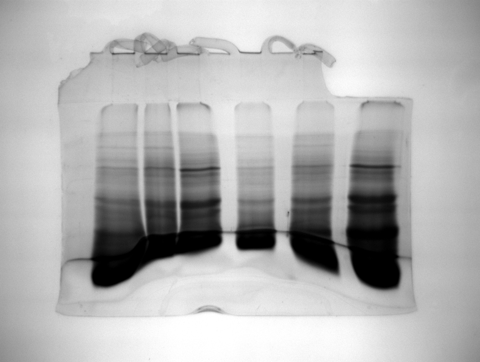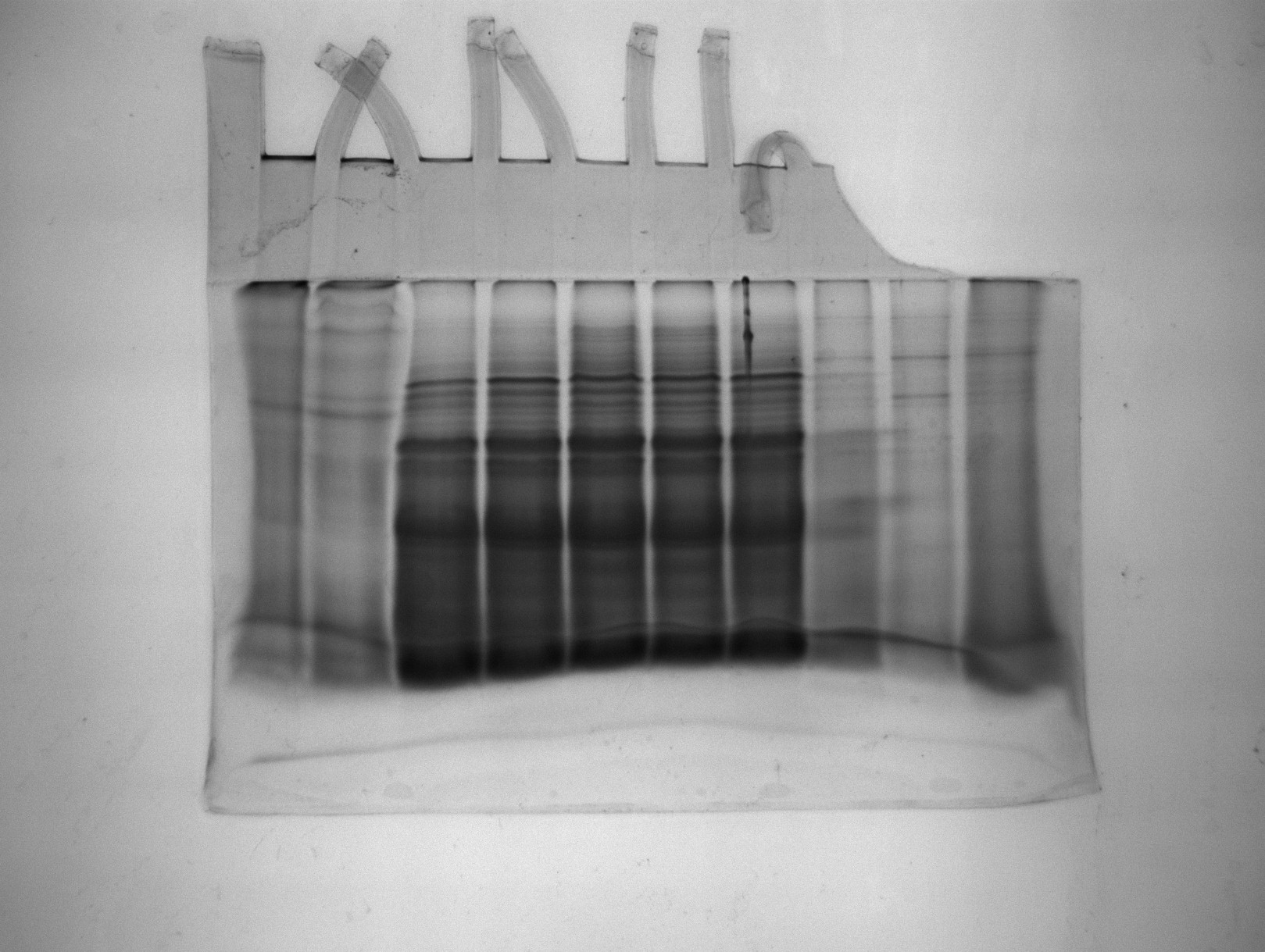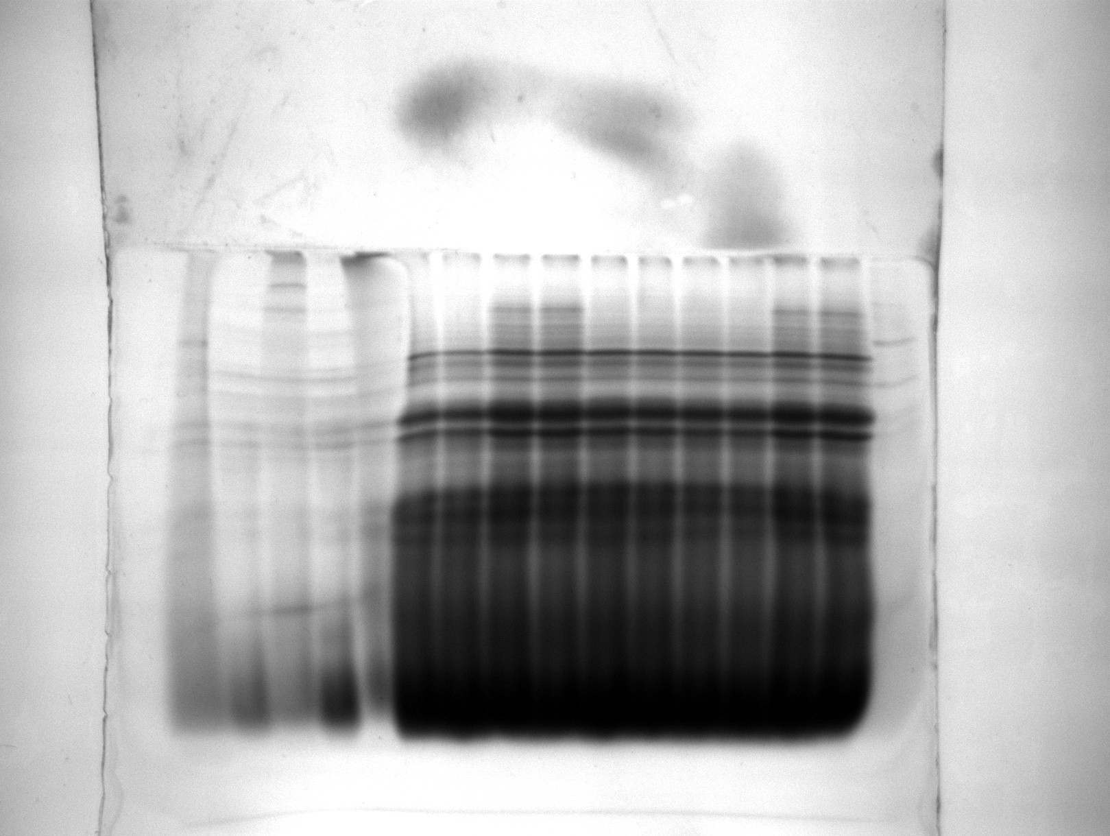 2。你是用银染吧?下面的小蛋白有点多的样子,染色时间过长了,看到主要条带出来了就立马终止染色。