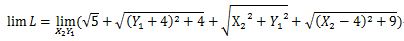 MinFunction sqrt(5)+sqrt((y1+4)^2+4)+sqrt(x2^2+y1^2)+sqrt((x2-4)^2+9);