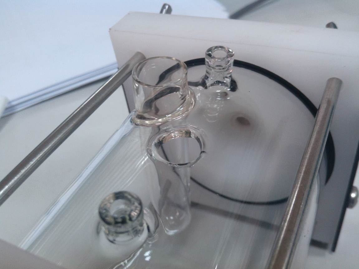 有通孔一侧是放辅助电极的,例如铂网。黑色方框处是放工作电极的。‘试管’形玻璃管是放参比电极的,下端小孔要连接一个塑料管到工作电极附近。显然你的小塑料管和辅助电极都没在上面。其余的口是用来接进气管和出气管的