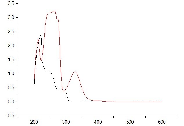 我想如果你要监控反应程度的话,建议你选用高效液相色谱法,先分离,在定量,这样就不叫准确了,这时候波长的选择可以根据DAD检测数据来定。我不知道你扫面这个溶液的浓度是多少,不过偏高了,A要控制在0.3——0.8之间,定量效果才会好。同时定量药学选波谱一介倒数为零的点。所以建议测定产物,在300——350nm之间的最大吸收波长。原料建议在200——250nm之间的最大吸收波长处。同时考虑到紫外仪器发出波长的波动,最好不要选择紫外峰较尖锐的地方,以为波长的略微改变会使结果变化比较大。 如果采用色谱法,监控产物的话,需要加上校正因子(一点法校正、标准曲线法校正等,请参看相关资料),这样比较准确,这时候波长可以设置在产物200——250nm之间的最大吸收波长。 |