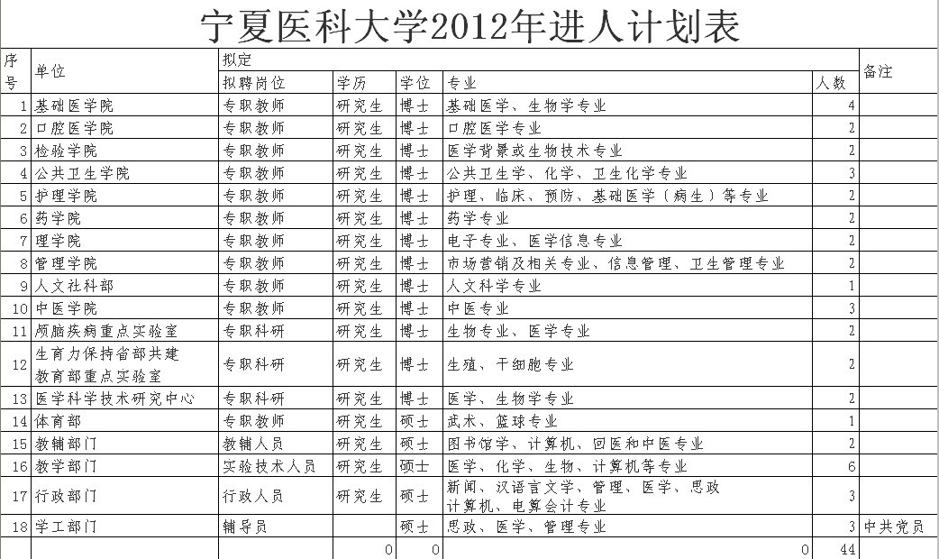 宁夏医科大学2012年公开招考录用工作人员公告http://202.201.152.6/index.php?id=1)[/url] 宁夏医科大学2012年进人计划表(http://202.201.152.6/news.php?id=1420) 联系方式 联 系 人:李老师 联系电话:0951—6980030 邮箱地址:nyrsc@163.com 单位地址:宁夏回族自治区银川市兴庆区胜利街1160号 联系单位:宁夏医科大学人事处 邮政编码:750004 宁夏医科大学欢迎您! [ Last edited by nxykdx on 2012-3-12 at 15:42 ] |