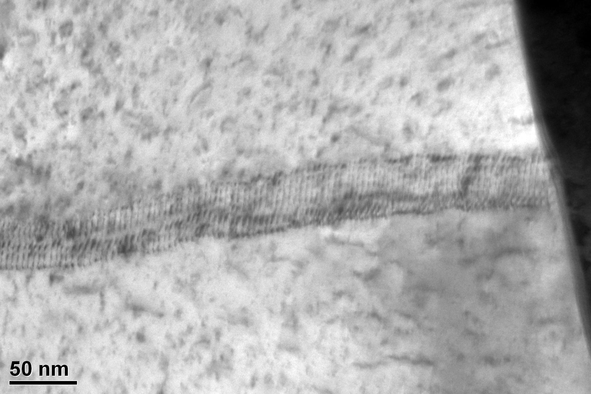 通过TEM在经过高应变率加载后的纯钨和铜当中观察到的一些平行排列的条状组织,目前还不清楚是什么,求高手指教。 纯钨TEM照片,中间部分平行排列的条状组织。 铜TEM照片,中间部分近似平行排列的条状组织。 |