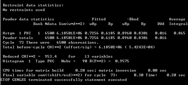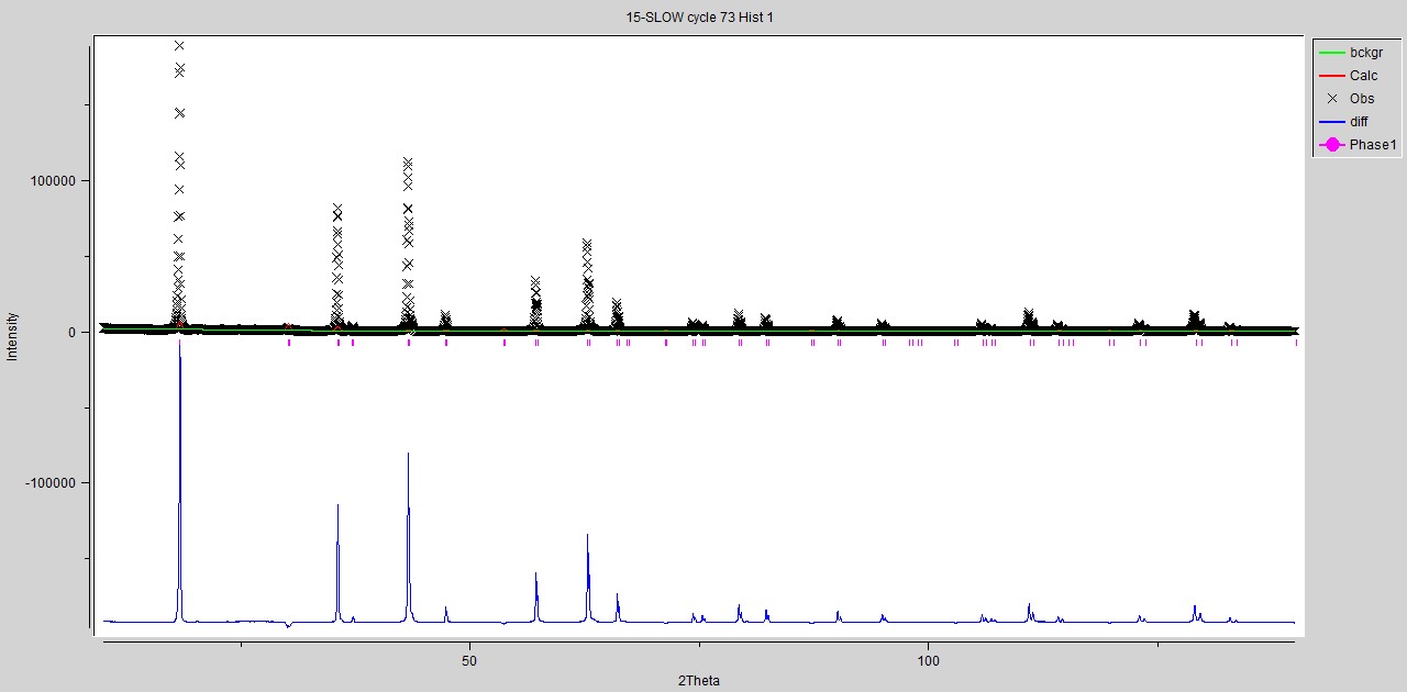 各位高手,样品为钛酸锂,GSAS中已经导入原始数据、instrument文件及CIF文件,下一步不知道各参数的精修顺序?以及如何取值? 1、最下面蓝色的那个差曲线,为什么全都是向上,而且很大? 2、红色的计算曲线为什么强度这么低? 3、修出来的CHI到950多,不是说要接近1才可以吗? 4、进行到这一步,不知道下一步的精修顺序了,高手指点一下顺序及如何取值 附图及过程,并附数据,请高手指点一下。 |