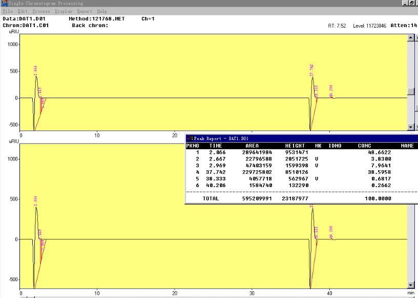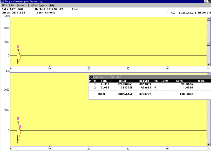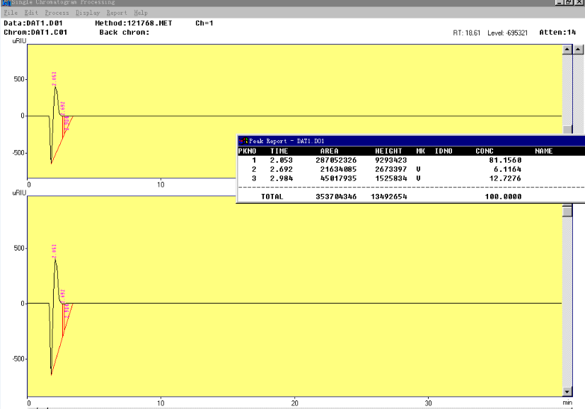 我使用岛津HPLC,流动相为甲醇:水=80:20,还是ODS柱子,视差检测器,分别对1% 1-溴十二烷,0.1% 1-溴十二烷,及0.1%甲苯的甲醇溶液进行检测,谱图如下: 前两图中图中没有1-溴十二烷的峰,后面图中甲苯前面的峰有个负峰不知为何?、 望高手给予指导,谢谢 |