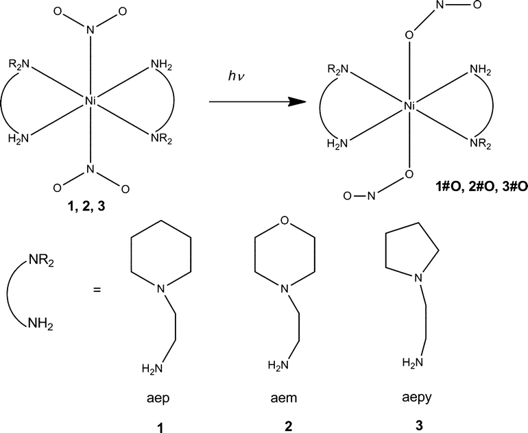 (a) Ground state structure of 1. (b) Photo-activated structure 1# showing the remaining ground state and 16% component of the metastable nitrito form. (c) Close-up of the NO2 group in 1#, separated into the two components and confirming the presence of the endo-nitrito form. Where shown displacement ellipsoids are plotted on 30% probability and hydrogen atoms and the disorder of the ethylene chain are eliminated for clarity.