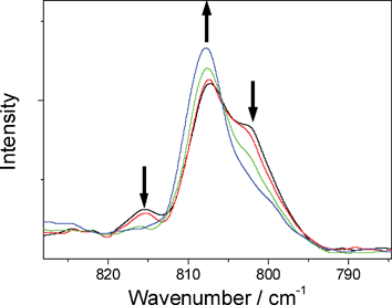 Solid state Raman spectrum of 1 after 4 h UV LED photolysis warmed from 100 K (black) to 110 K (red), 120 K (green) and 130 K (blue).