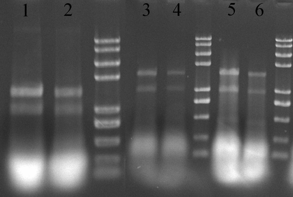 1和2是trizol提取后的样品,有少量基因组DNA残留,所以就用了DNaseI消化半小时。3和4是DNaseI作用后的样品电泳。感觉浓度不够,又做了氯仿抽提,结果为5和6。非变性琼脂糖,1%,80V,30min。