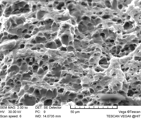 图片中两种断口形貌中都有大量韧窝存在,韧窝尺寸很小~5um。正如3楼所言,韧窝并非等轴韧窝,而是有一定的方向,因此断裂非拉伸正断,而是剪切断裂(或者至少你所拍摄照片的位置与加载轴并不垂直,而是成~45度)。 相比而言,第二幅图中断面更加平坦,说明断裂时消耗能量较小,表明韧性相对较差。 第一幅图中的韧窝较深,断面起伏也较大,说明韧性较高。。 |