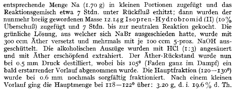 | 将11.27g(I)溶于50ml无水苯中,然后一小份一小份将其加到已加热到80度相应1mol浓度金属钠(1.70g)的溶液中(文中没指明是什么溶剂,可能是无水乙醇----译者),反应混合物加热回流七小时,之后加入12.14g(II)(10%过量),加热7小时直至呈中性。浅绿色溶液,从中已有溴化钠析出,与300ml乙醚混合,用每次100ml5%的氢氧化钠箤取多次,乙醇相用盐酸(1:3)酸化后,再用乙醚彻底箤取,脱掉乙醚的残留物于0.5mm汞柱下蒸馏,前馏份蒸至105度(在汽相中完全为线状体)它很快就变凝固了。主馏份于120-130度蒸出,它还得在0.6mm汞柱下仔细分馏,蒸走少量前馏份后,主要产物于118-122度蒸出3.2g,理论量的19.6%。 |