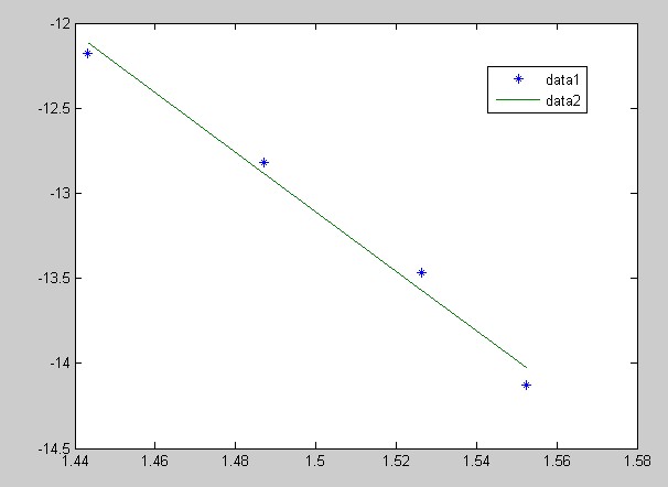 用Matlab对一组点进行直线拟合,请问如何将附图中l只显示date1的legend,而不显示拟合直线data2的legend?具体命令是什么,非常感谢!