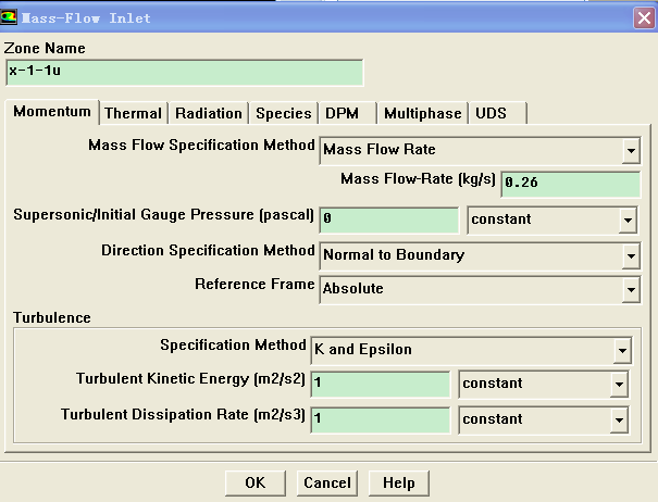 请问在边界条件的设置中质量流量入口面板的湍流参数如何设定?