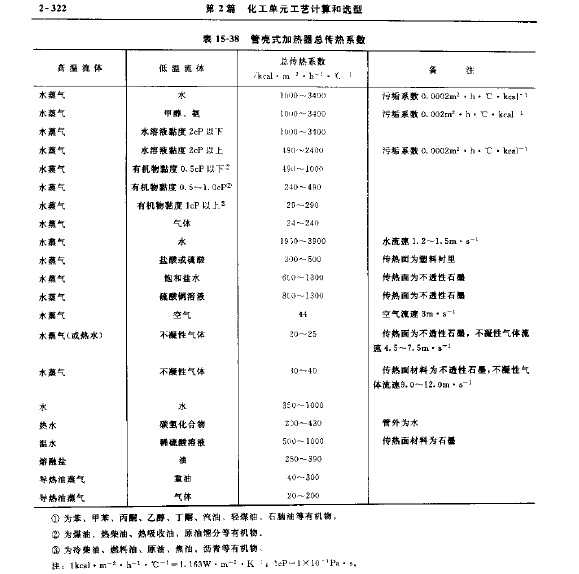 则总的传热系数为K=1/(1/h1+1/h2+d(管子壁厚)/k1).当然这个计算是大概的值,一般K的数量级为10^3到10^4之间,经验公式满足3楼给的图。