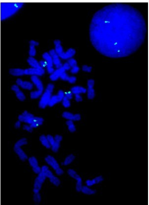 遇到问题了!紧急求助! 最近做了FISH的实验(样品:猪的血液样品),并发了图片给我,但是我不知道怎么区分是在哪些染色体上! 请问各位,如何判断这些染色体的信息?这些信号是在几号染色体上?说白了就是我怎么知道这些染色体的名称,是2号还是6号,还是X染色体? FISH的结果 |