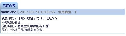 对ID wolffiend 教师之家禁言三个月的处罚备案 ID wolffiend 的虫友多次在教师之家的回帖中使用不文明言语攻击他人,已被违规记录三次:https://muchong.com/bbs/userlog.php?uid=801305 且小窗攻击与其有争执的虫友: https://edu.muchong.com/attachment/c7/45/664055_1332487518_123.jpg 禁言三个月,特此备案 [ Last edited by joyfulnoise on 2012-3-23 at 15:42 ] |
