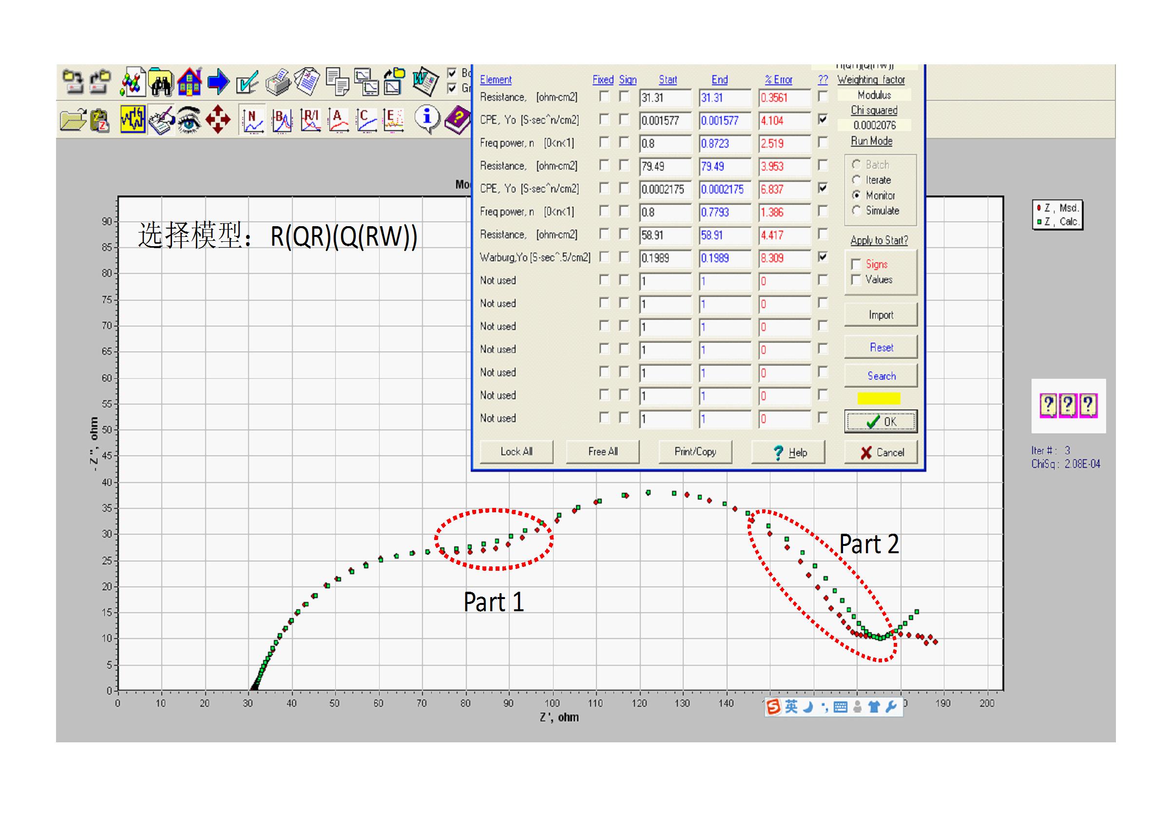 小弟最近用ZsimpWin对我做的量子点敏化电池进行拟合,拟合结果不太满意,其中从图中可以看出两部分不太满意,即Part 1和Part 2。选择的等效电路我已经在图中给出R(QR)(Q(RW)),我想问高手们如何改对话框中的参数才能使得拟合的数据与实测的数据更为吻合,非常感谢,好人有好报!!!