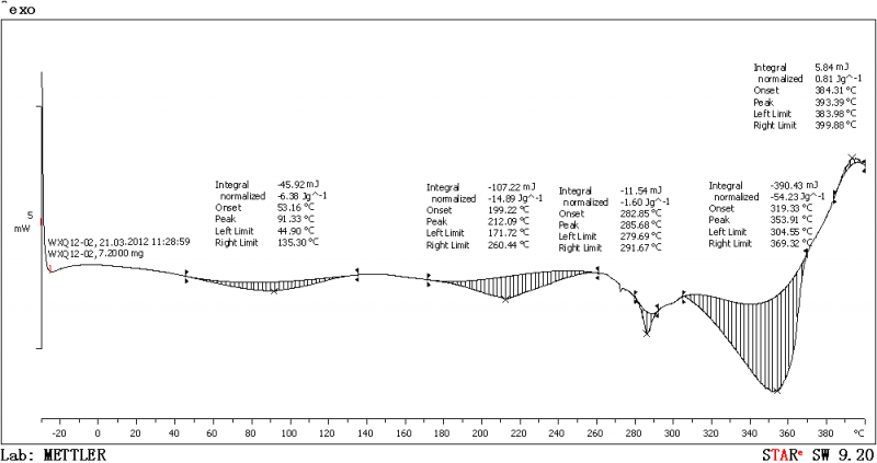 Tg是对于聚合物来说是非晶聚合物的玻璃态与高弹态之间的转变。其分子运动本质是链段运动发生“冻结”与“自由”的转变。 (这是百度百科里的) 就PU而言,Tg是软段开始运动的温度,由于软段的弹性好,而硬段较刚性,所以从玻璃态升温过程中,先开始膨胀和运动的一定是软段,大多在0度以下;而硬段的Tg一般在200度以上。我们平常说的Tg,一般是指软段的。 PU的Tg主要取决于两个因素:(1)软段本身的性质;(2)相分离的程度 软段本身越柔软,越容易运动,Tg越低。所以PEG的就比PCL的要低。 软段和硬段之间的相分离程度越大,Tg越低。 PTMG1000我也做过,不过没去表征,理论上来说,分子量1000有结晶的可能性不太大,所以你这里没有熔融峰。 后面那个放热峰,会不会是分解的时候又被氧化,所以会放热,我不是很确定。 你的那些吸热和放热我觉得不能说明什么,因为物质要较高的温度下会产生什么样的变化,比低温下要不确定很多。建议你重新去测试,把温程重新设定。这张图不用纠结了。 |