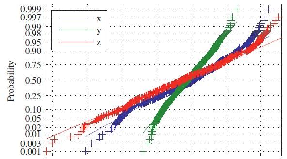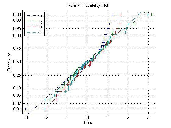 normplot(X) %若X为向量,则显示正态分布概率图形,若X为矩阵,则显示每一列的正态分布概率图形。