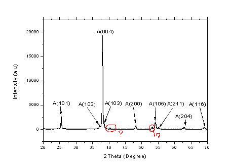 大家帮忙看看TiO2这个XRD图,第一次做,所以想问问还有两个峰位是什么峰呀?图中用红色问号标记的,谢谢了!