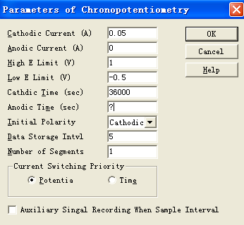 Cathodic current: 0.05 Anodic current: -0.05 High E limit: 1Low E limit: -0.5 Cathdic Time: 36000 Anodic Time: 36000 Initial Polarity: Cathodic/Anodic 均可,只决定第一个循环是充电还是放电 Data Storage Intvl: 最小可以设到0.002,为采样点的时间间隔,如设置为0.02,即0.02s记录一个电压数据 Number of Segments: 2000,充电是一个segment,放电又是一个segment,一个完整的充放电是2个segment,这就是1000次充放电?下面Current Swithing和Auxiliary就按照默认的,希望能帮到你! |
