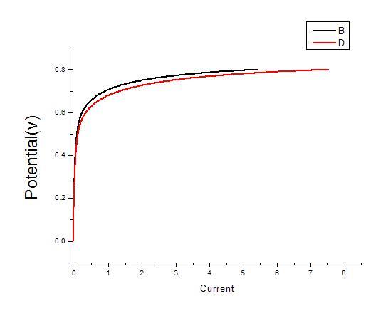 亲高手们,帮我解解!我做的是Pd催化乙醇的极化曲线。我想作出上图的曲线,可是我的I-E曲线确如下图(是用LSV从0.8V向0v扫得到的图),我作的是阴极极化,我想问下如何做?电位范围如何设?扫的方向如何?如何得到功率图?非常感谢! |