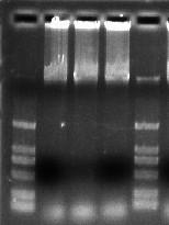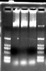 今天提出的rna,好像有一点弱弱的28s带,很弱很弱的那种,不知道是不是,要是有降解的话是不是得拖尾啊?用的takala的盒子,提取的材料材料为针叶类植物的幼嫩组织,难道是我操作有问题还是盒子不行啊???不行我就自己配试剂,或者大侠们给推荐个盒子。marker为DL2000,如下图:可以看出有基因组dna污染和蛋白污染,请高手分析一下。。。先谢过了 |