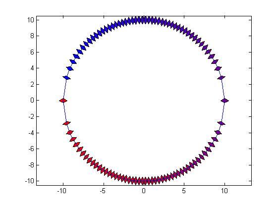 据我所知没有这种现成的命令(一个命令就能实现楼主所说的功能)。 但是用matlab自己编程的话 “在画出质点圆形轨迹的前提下,画出菱形所指出的方向。菱形的位置和指向数据都可以得到。菱形的颜色从深到浅代表着时间的从前到后” 这些都是可以实现的。 |