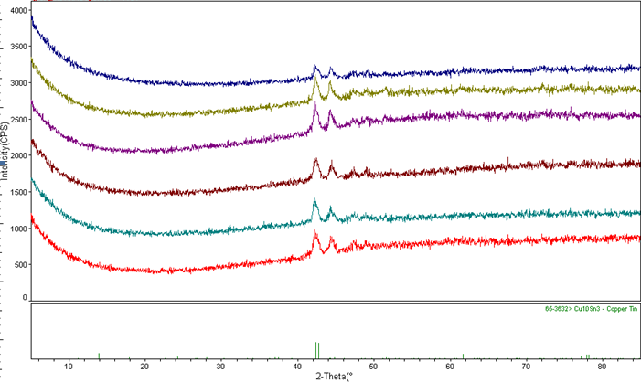 我做的XRD图谱,做出来的图峰很杂,强度不够,而且我对卡片怎么都对不上,请教了一些人都没很好的解决,所以想到万能的小木虫,请大家帮帮我吧 我的试样是Co粉(50~60%)、Cu(26~30%)、Sn(6~10%),其余Fe。019试样加入微量(低于1%)的氧化铈,020加入微量的氧化镧,021加入微量的氧化钇,022加入微量五氧化二钒。 不胜感激,还请高手多指教 |