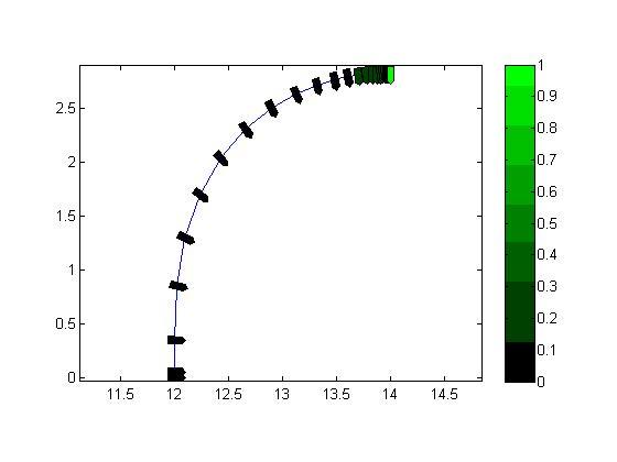 在帖子http://muchong.com/bbs/viewthread.php?tid=4346449中部分实现了绘图目标。感谢sogooda朋友! 现在情况是:得到了520*3的矩阵,前两列是点的XY坐标,第三列是与圆心成的角度。 现在想要实现: 一、colorbar按矩阵行数从黑色[0 0 0]过渡到绿色[0 1 0], 二、在图上划出形状,首先是质心与圆心连线和Y轴角度的值是第三列数据,然后画出图上所示的形状并填充采样时刻(所在的第几行)对应的颜色。 希望得到大家的建议与帮助!效果图和mat文件如下。 效果图[ Last edited by plxh on 2012-4-8 at 09:43 ] |