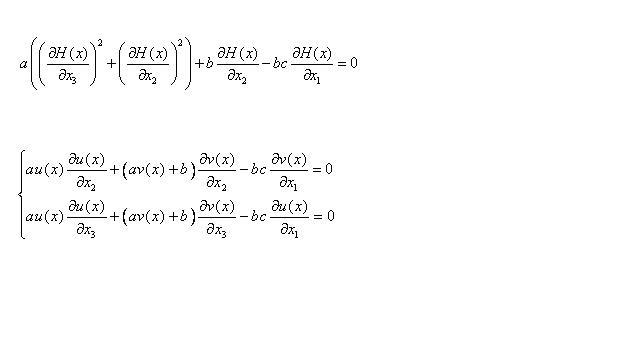 附件中,a、b、c为常数; H(x)、u(x) 、v(x) 均为关于x1 、x2 、x3 的函数。 请问上面的第一个偏微分方程属于哪一类偏微分方程?能求出解析解吗? 第二个偏微分方程组能求出u(x),v(x)的解析解吗?怎么求?非常感谢! |