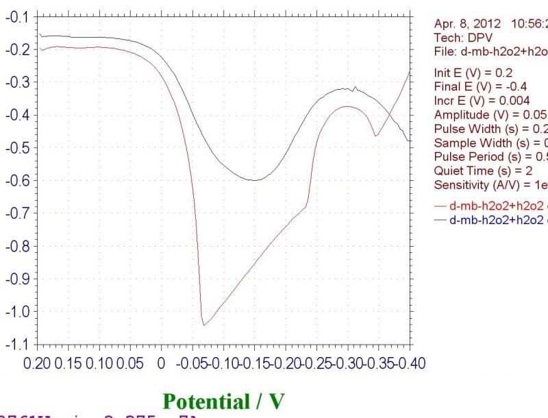 我在修饰了辣根过氧化物酶,想知道修饰上了没有,跑dpv图,就出现以一下的情况,溶液是5μl的30%的过氧化氢放入ph7.0的pbs溶液中,又加入了一定量的1mmol/L的亚甲蓝溶液。如果说出现了斜线的那幅图是因为溢出了,我五分钟以后又将同一个电极放入同样的溶液中,跑出的图就是上面圆弧状的了。是为什么呢? |