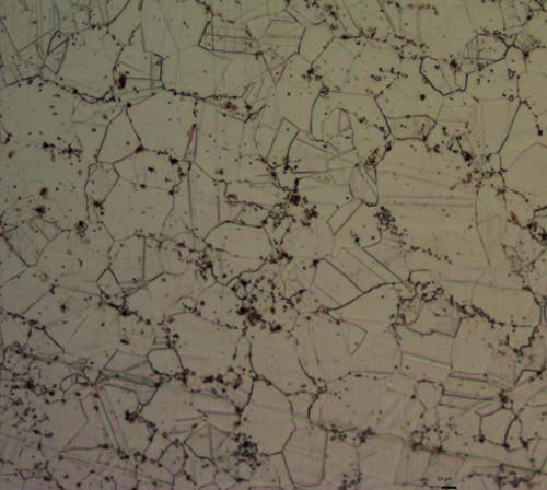 | 有孪晶,晶界没有完全腐蚀出来,黑点个人以为是腐蚀造成的,可以不予理会,划痕会影响对孪晶的判断,所以建议再改进磨金相水准,改善腐蚀液,最好给出具体的合金成分和热处理工艺,以帮助判断 |